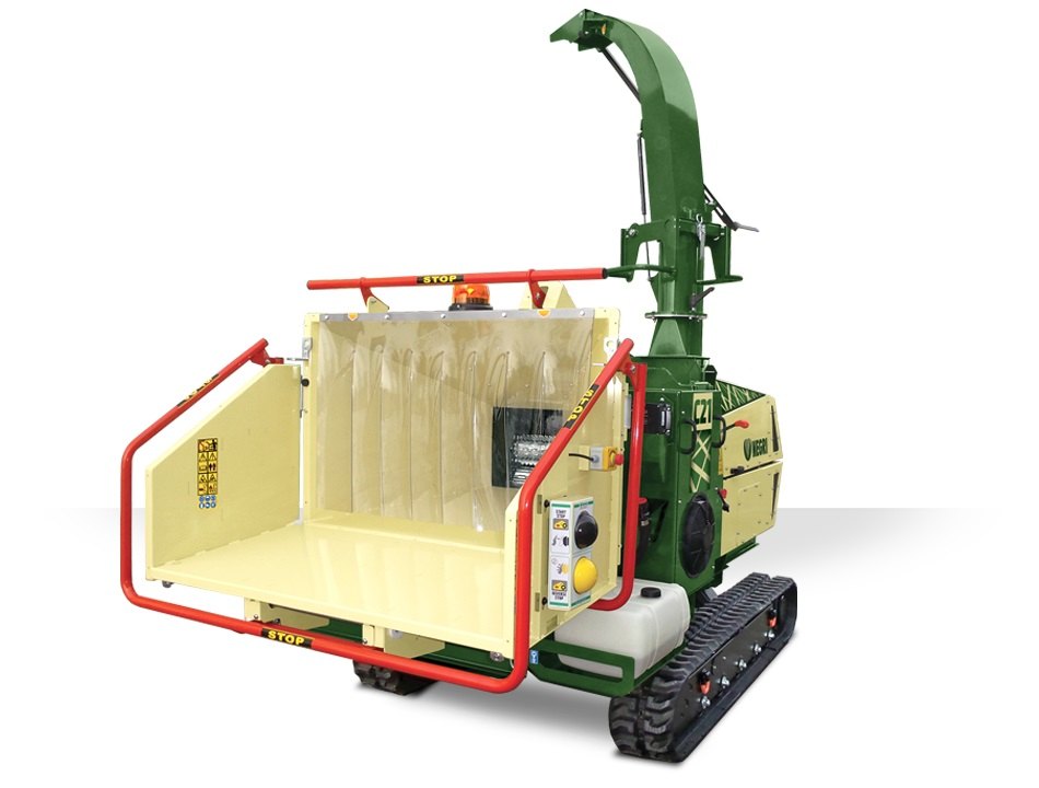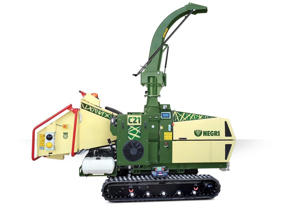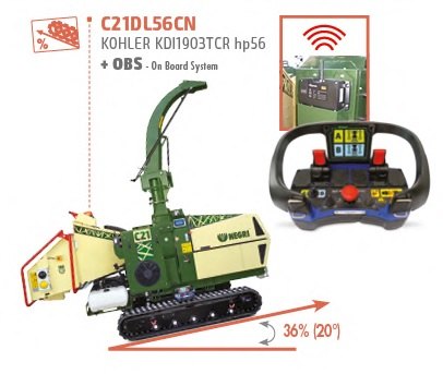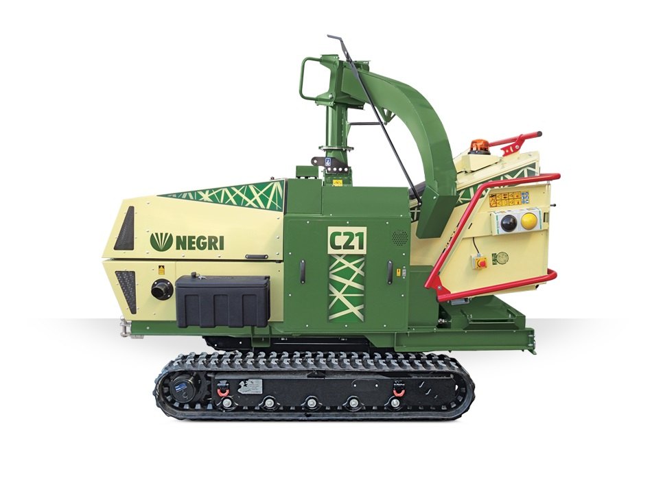 Profesionální naftový štěpkovač Negri bio C21DL56CN, pásový podvozek. S motorem Kohler KDI1903TCA o výkonu 56 HP. Doporučený průměr štěpkovaného materiálu 210 mm.